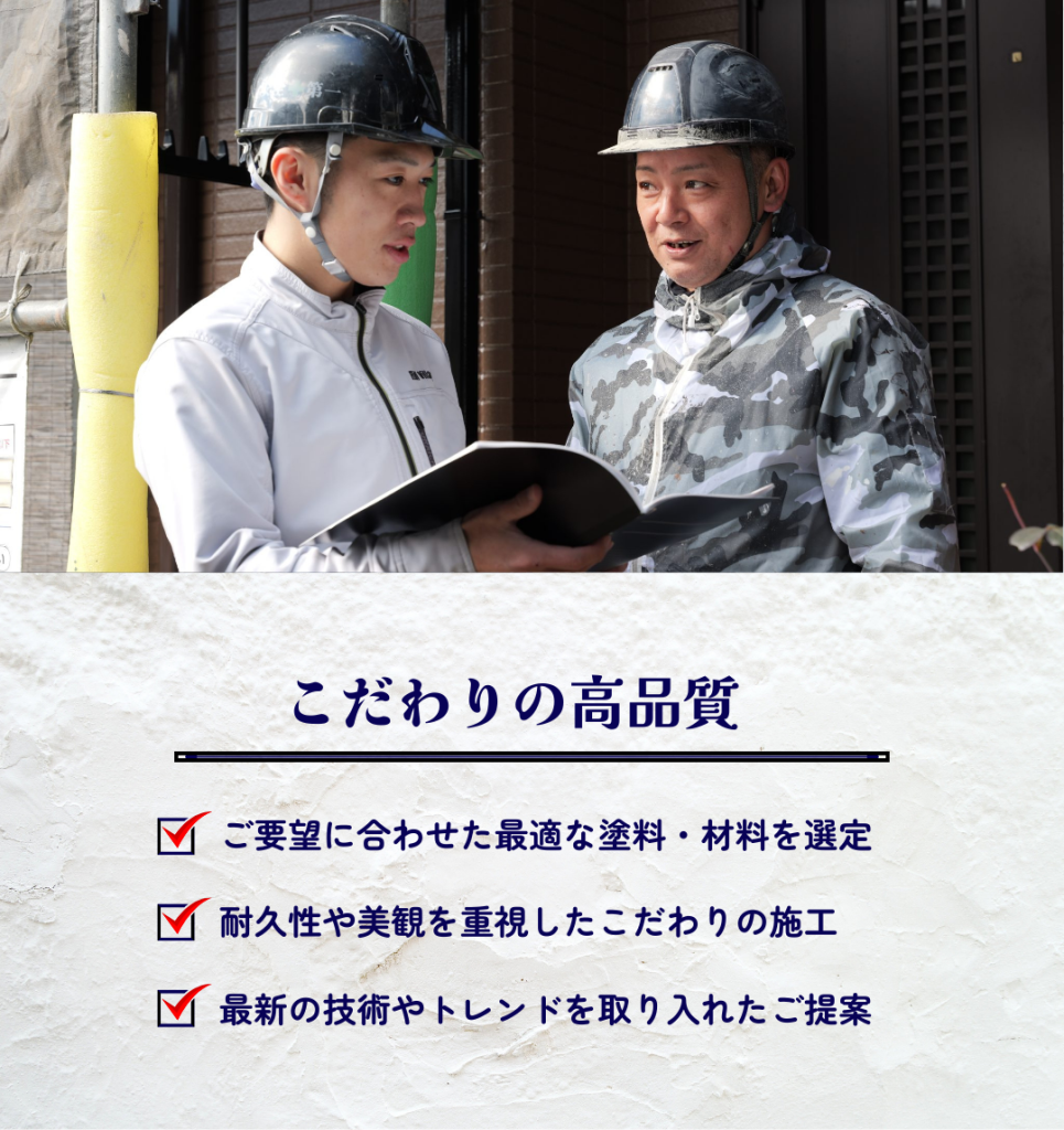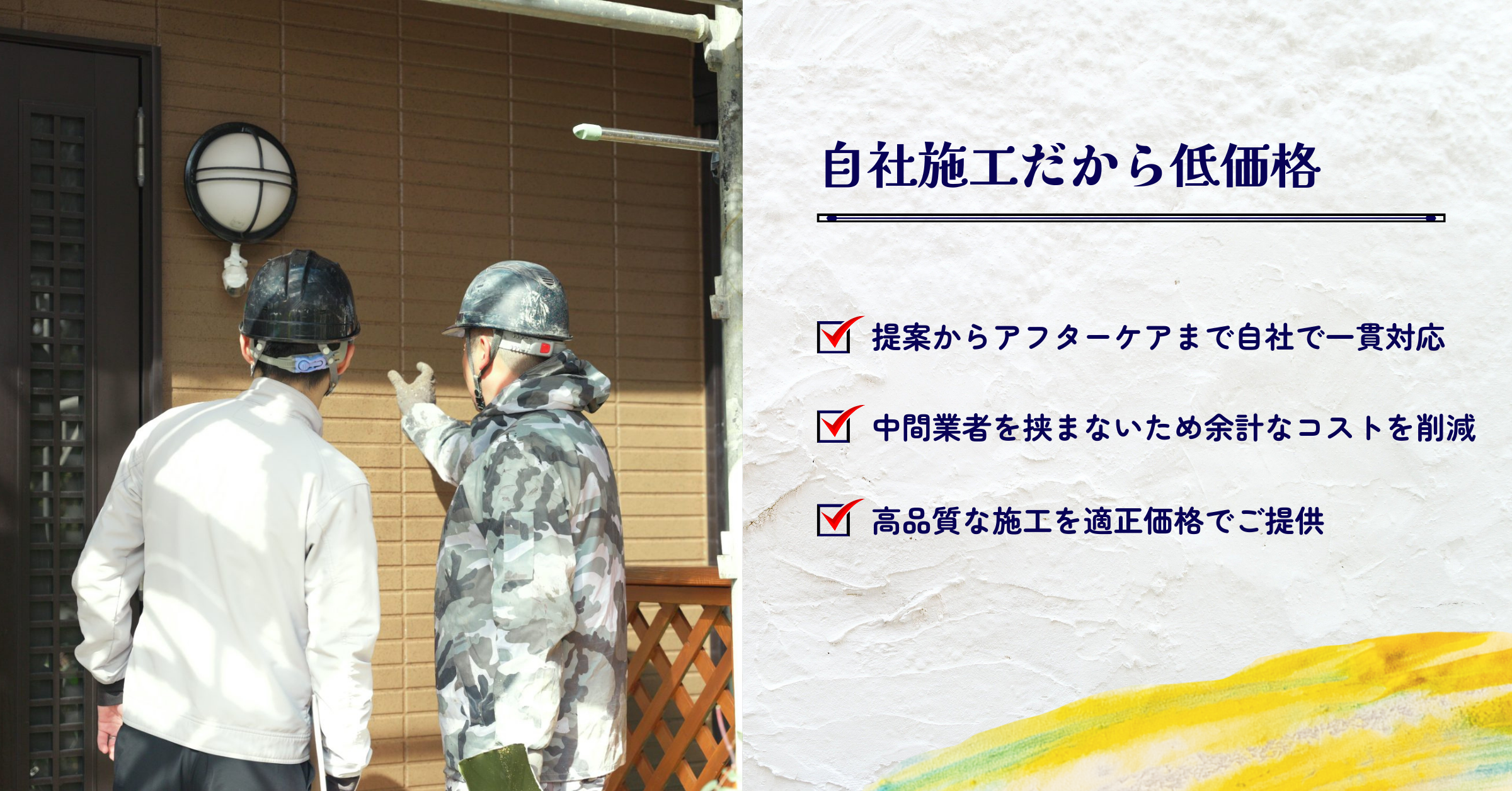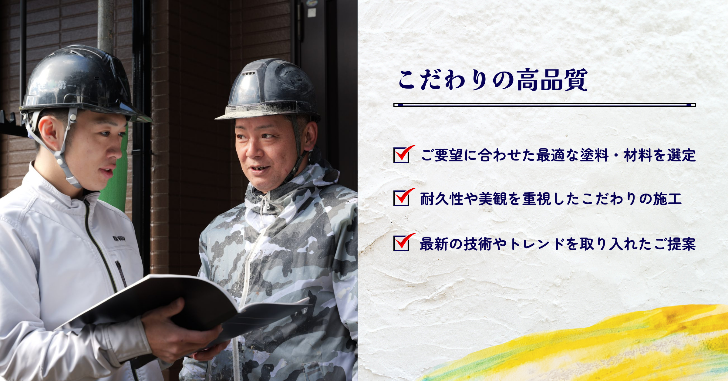 こだわりの高品質を低価格で提供する外壁塗装専門店です。自社施工なので、提案、施工、アフターケアまでを一貫して提供しています。 住まいとは、そこに住む家族にとっていつまでも安心できる場所でなければならないと考えています。 お客様の人生に長く寄り添える会社をめざしています。