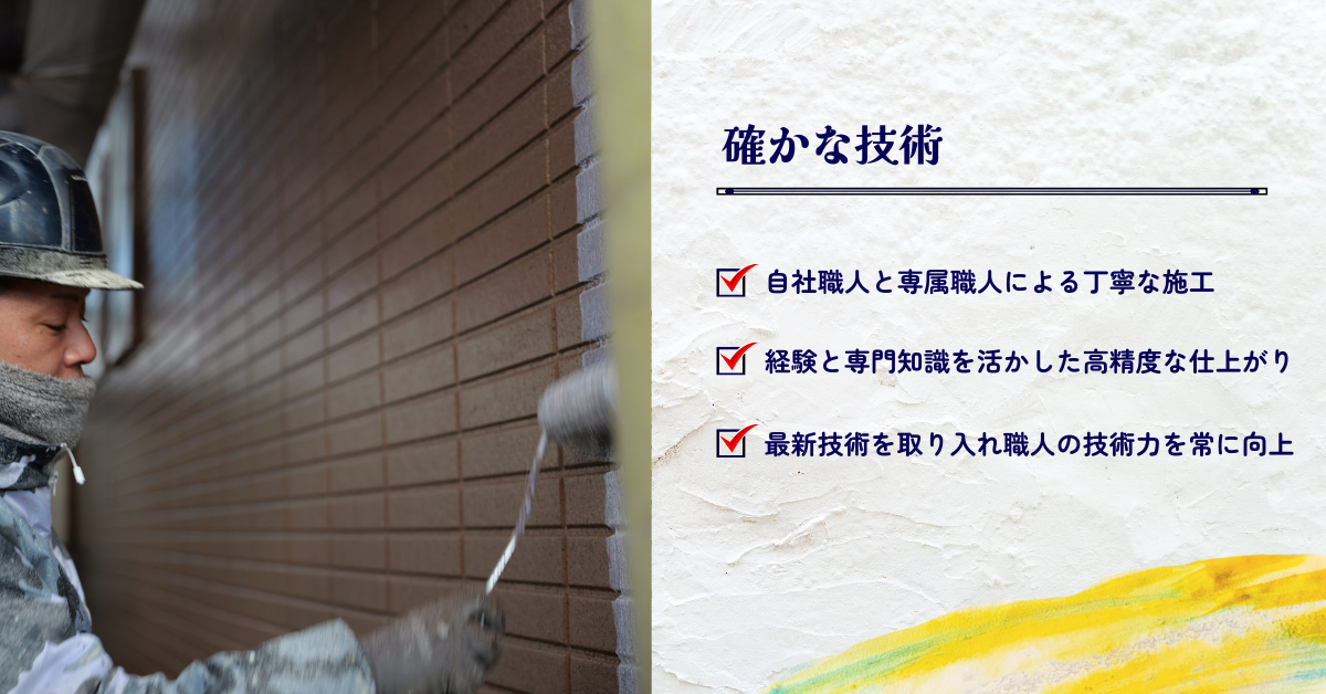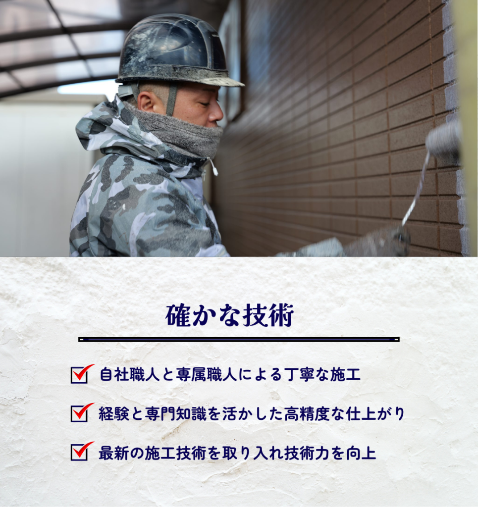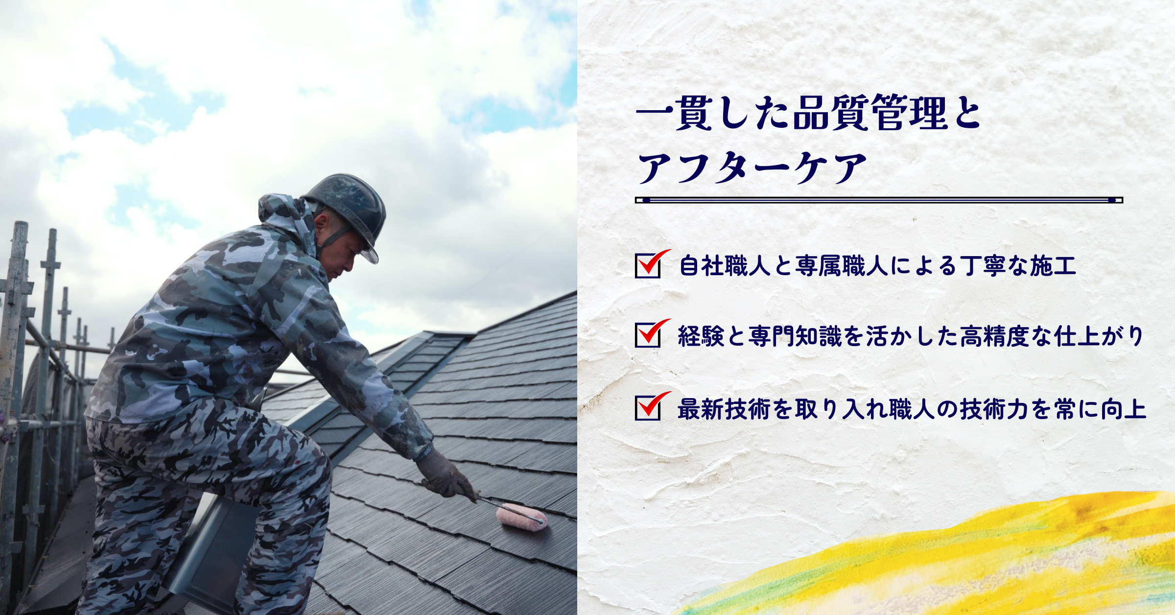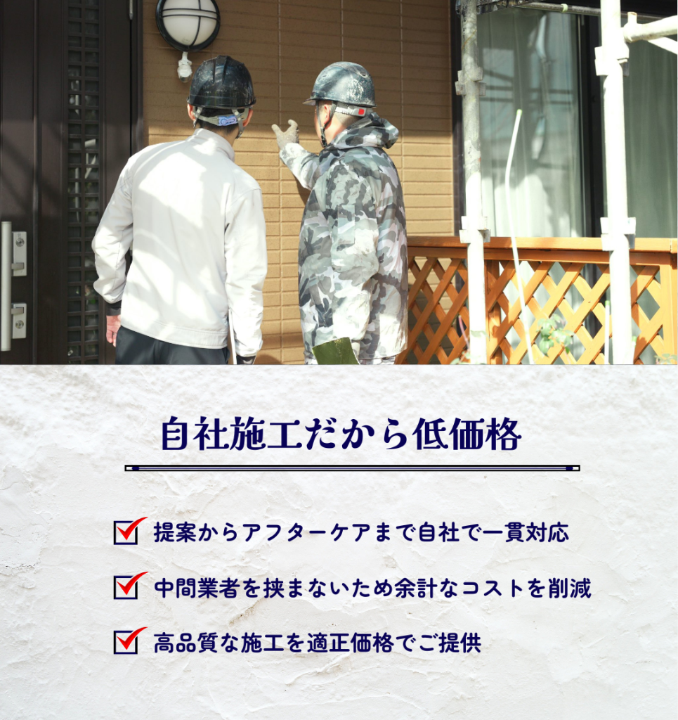 こだわりの高品質を低価格で提供する外壁塗装専門店です。自社施工なので、提案、施工、アフターケアまでを一貫して提供しています。 住まいとは、そこに住む家族にとっていつまでも安心できる場所でなければならないと考えています。 お客様の人生に長く寄り添える会社をめざしています。