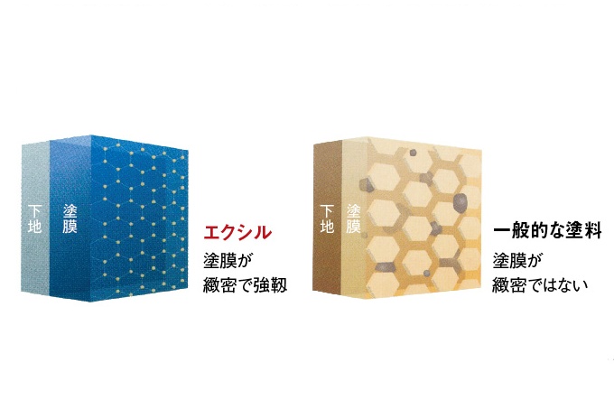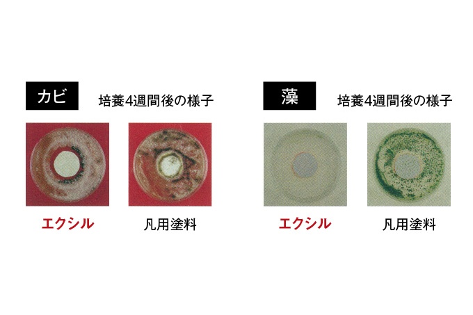 エクシルは「かび抵抗性試験方法」及び「茶抵抗性試験(社内試験による)」に合格。美観保持力の向上につながり、さらにアレルギーの原因であるカビを抑制する、健子にも優しい塗料です。