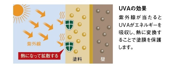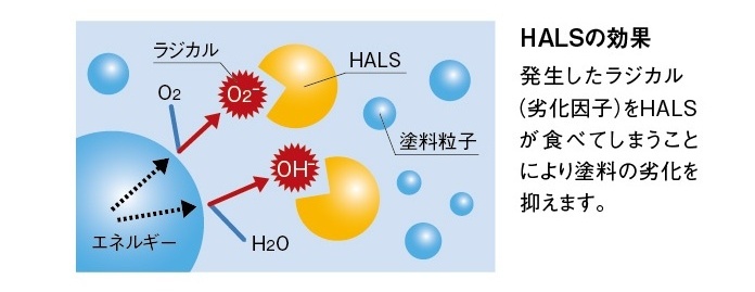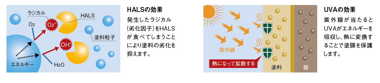 塗膜劣化の広がりを防ぐ「HALS」と、紫外線から塗膜を守る「UVA」をダブルで配合することで